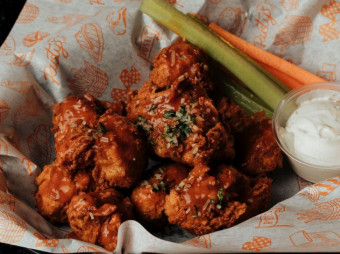 Alitas fritas y crujientes bañadas en salsa de tu elección.
